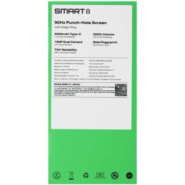 Встроенная память модели составляет 64 ГБ, которую можно увеличить с помощью карты microSD. Смартфон Infinix SMART имеет поддержку 2 SIM-карт и сетей 4G. Основная камера с кольцевой светодиодной вспышкой имеет разрешение 13 Мп, а фронтальная – 8 Мп. Аккумулятор емкостью 5000 мАч обеспечивает длительное (до 961 ч в режиме ожидания) время автономной работы. За конфиденциальность данных владельца отвечает сканер лица и отпечатков пальцев. Последний расположен сбоку.