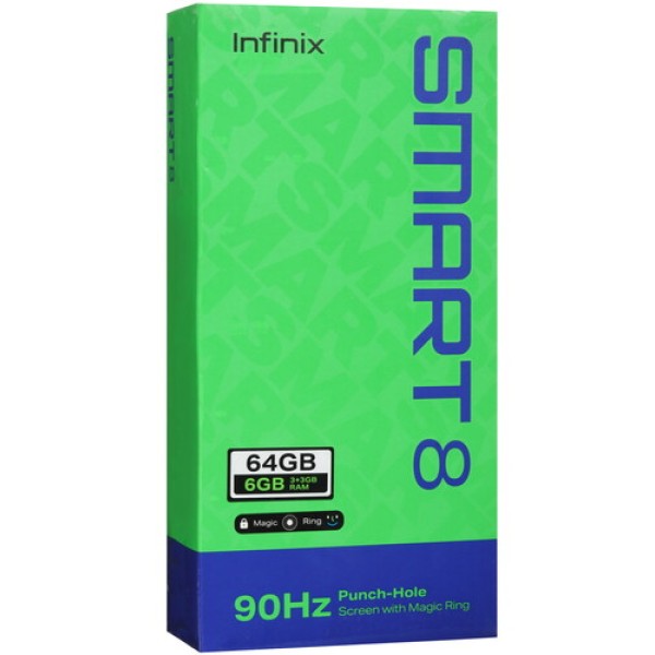 Смартфон Infinix SMART 8 обладает 6.56-дюймовым дисплеем с олеофобным покрытием и разрешением 1612x720 пикселей. Он демонстрирует яркий и четкий экран с частотой обновления 90 Гц. Для шустрой работы устройство оснащено 8-ядерным процессором Unisoc T606 и графическим ускорителем Mali G57 MP1, а также 3 ГБ оперативной памяти.