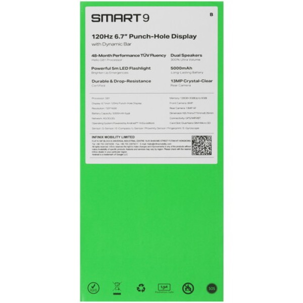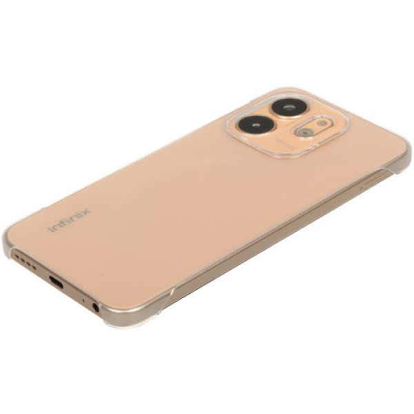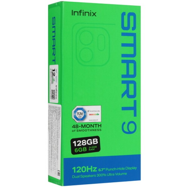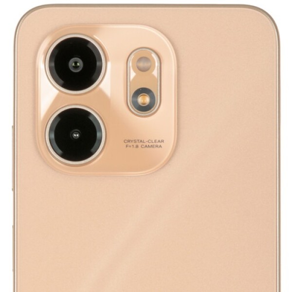 Смартфон Infinix SMART 9 выполнен в прочном корпусе золотистого цвета с защитой от пыли и брызг воды по стандарту IP54. Экран диагональю 6.7 дюйма с частотой 120 Гц гарантирует плавность динамичного изображения. Матрица IPS с яркостью 500 нит передает четкую и красочную картинку. На панели Smart отображаются важные уведомления. Стереодинамики с усилением звук формируют объемное аудио.