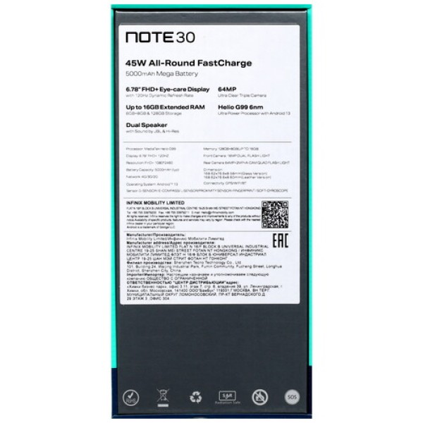 Основная камера с тремя датчиками 64+2+0.3 Мп и вспышкой LED создает реалистичные снимки в разных условиях освещенности. Спереди Infinix NOTE 30 установлена камера 16 Мп для селфи и видеосвязи. Устройство поддерживает две карты SIM, беспроводные интерфейсы Wi-Fi и Bluetooth, бесконтактную оплату по NFC.