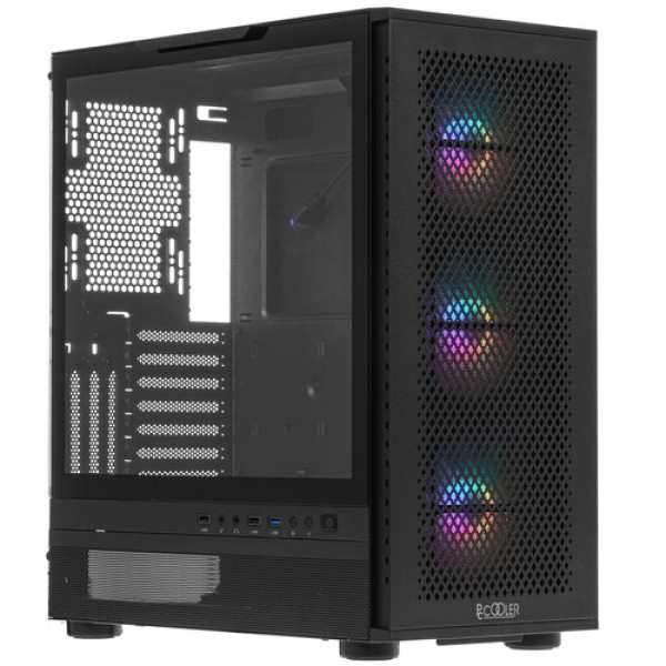 Корпус PCCooler ME200 MESH BK из металла и пластика черного цвета дополнен боковой панелью из закаленного стекла. Она обеспечивает обзор внутреннего пространства и делает корпус оригинальным. Внутри установлены 3 вентилятора диаметром 120 мм с ARGB-подсветкой, которая управляется кнопкой на корпусе. Все кнопки и основные USB-разъемы расположены на левой панели. Благодаря стандартным размерам корпуса в него помещается материнская плата форматов E-ATX, Micro, Mini и Standard. Для мощной видеокарты есть отсек длиной 380 мм.