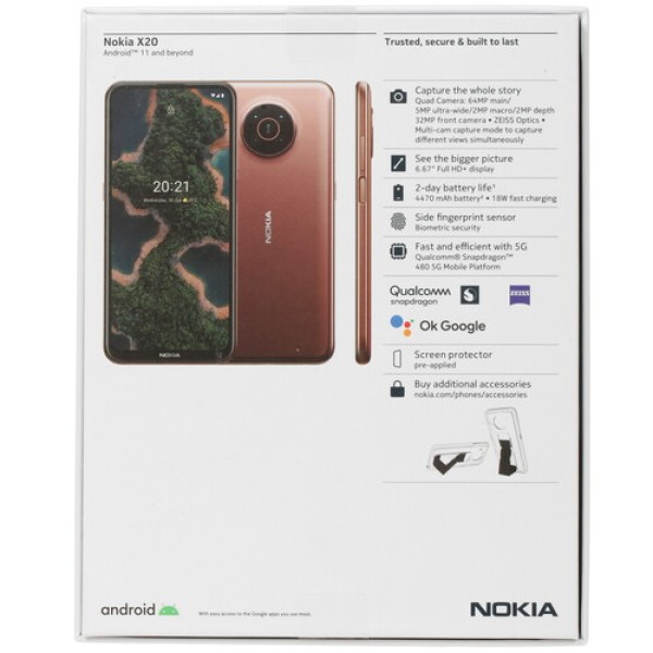 Основная камера с 4-мя датчиками 64+5+2+2 Мп и широкоугольным объективом позволяет создавать реалистичные изображения в любых условиях освещенности. Функция определения глубины сцены позволяет делать портретные снимки с эффектом боке. Режим Dual Sight позволяет вести съемку с разных ракурсов, что помогает реализовать творческие идеи. На передней стороне установлена камера с разрешением 32 Мп для запечатления креативных селфи. Аккумулятор емкостью 4470 мА*ч гарантирует длительное время автономности Nokia X20 и поддерживает ускоренное восстановление энергоресурса.